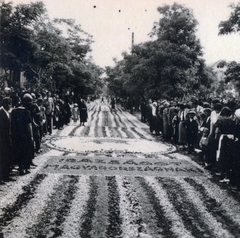 Szabadság út (József főherceg utca). Úrnapi körmenet virágszőnyege a Templom tér felé nézve.