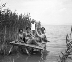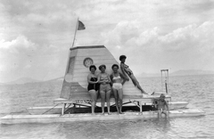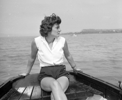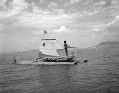 Kabinos katamarán a Balatonon. Háttérben takarva a Badacsony.