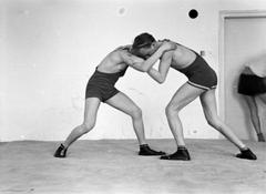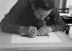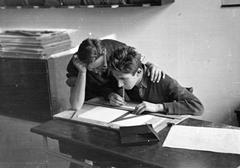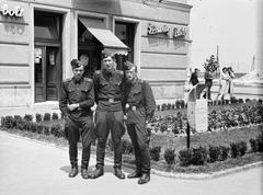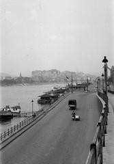 kilátás a Szabadság hídról a pesti rakpartra, szemben a MAHART nemzetközi hajóállomása. A háttérben balra a Budavári Palota (korábban Királyi Palota), jobbra a lerombolt Erzsébet híd pesti hídfője.
