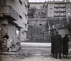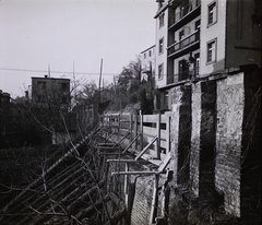 Attila út 127. (ekkor Attila utca 89.) és a mellette lévő udvar. Szemben fent a Jávorka lépcső, felette a Hadtörténeti Múzeum látszik. A felvétel hegyoldal megcsúszása után a Logodi utcai támfal építésekor készült.