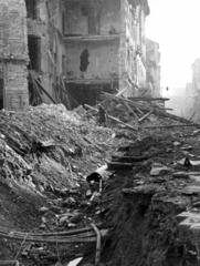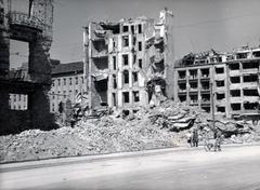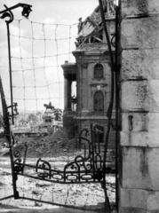 Bem (Margit) rakpart a Vitéz utca felé nézve, középen az 1945. január 2-án felrobbant Fő utca 59. és Vitéz utca 2. számú ház romjai.