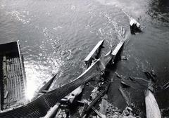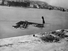 pesti alsó rakpart a Markó utca közelében. Az elsüllyedt VIII. számú csavargőzös kéménye látszik ki a Dunából, jobbra a lerombolt Margit híd pillérei.