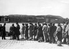 pesti alsó rakpart, dunai átkelésre várók sora, háttérben a budai oldalon a Bem (Mónus Illés) rakpart és Rózsadomb.