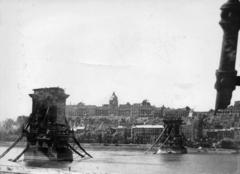 a lerombolt Széchenyi Lánchíd és a romos Királyi Palota (később Budavári Palota) a Széchenyi István (Ferenc József) tér felől nézve.