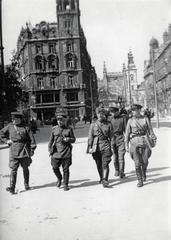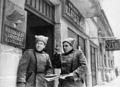 "Frolov tábornok, gárda hadosztályparancsnok megbeszéli törzsfőnökével a budai harcok egyik részhadműveletét." A felvétel a Gergely utca 39. számú ház előtt készült.
