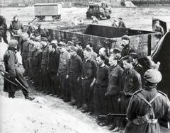 az eredetileg hadifogolytábor, 1943-tól koncentrációs tábor. Brit katonák őrzik az SS-katonákat / a tábort irányító csapatot.