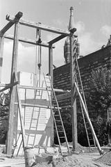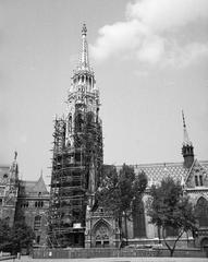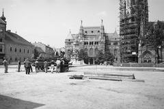 Szentháromság tér, balra a régi budai Városházatornyos épülete. Szemben a Szentháromság-szobor mögött a Pénzügyminisztérium épülete, jobbra a Mátyás-templom.