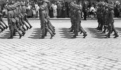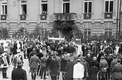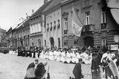 Kelenföldi pályaudvar, dr. Theodor Innitzer bíboros, Bécs hercegérseke (középen) a Pázmány Péter Tudományegyetem jubileumi ünnepségére Budapestre érkezett. Mellette jobbról Serédi Jusztinián hercegprímás, balról dr. Angyal Pál egyetemi tanár. A felvétel 1935. szeptember 26-án készült.