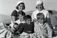 a szanatóriumban ápolt fiúk ápolónőjükkel a teraszon.