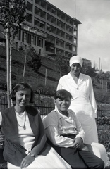 a szanatóriumban ápolt fiú ápolónőjével és édesanyjával, háttérben a kórház épülete.