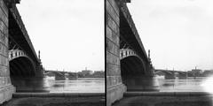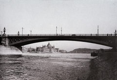 Margit híd és az Országház a budai alsó rakpartról nézve. Távolban a Gellért-hegy. A felvétel 1898 körül készült.