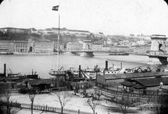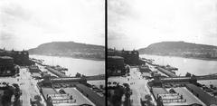 kilátás a Magyar Tudományos Akadémia épületéből a Gellért-hegy és a Duna felé. Előtérben balra a Széchenyi István (Ferenc József) tér és a Lloyd-palota. Jobbra a Széchenyi Lánchíd pesti hídfőjénél a teherhajó kikötő és raktárai a pesti alsó rakparton. A felvétel 1894-ben készült. A kép forrását kérjük így adja meg: Fortepan / MMKM. Levéltári jelzet: MMKM TTFGY 2019.1.