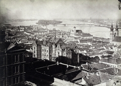 kilátás a Halászbástyáról a Vízivárosra a Margitsziget felé nézve. A felvétel 1876 körül készült. A kép forrását kérjük így adja meg: Fortepan / Budapest Főváros Levéltára. Levéltári jelzet: HU.BFL.XV.19.d.1.06.042