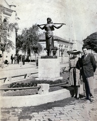 Kálvin tér, a Pásztorlány szobra (Kocsis András, 1941.). Balra a református templom és parókia.