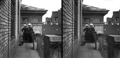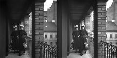 Trefort-kert, Eötvös Ilona és Rolanda a Budapesti Tudományegyetem Fizikai Intézetéből (ma Eötvös Loránd Tudományegyetem Bölcsészettudományi Kar D épület) folyosóján. Kilátás a Puskin (Eszterházy) utca felé. A felvétel 1900 előtt készült.