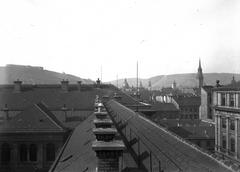 Trefort-kert, kilátás a Budapesti Tudományegyetem Fizikai Intézetének épületéből (később az ELTE / Eötvös Loránd Tudományegyetem Bölcsészettudományi Kar D épülete) a Múzeum körút felé. Balra a Gellért-hegyen a Citadella, jobbra a Belvárosi Ferences templom tornya, ettől balra a régi Pesti Városháza tornya látható. A felvétel 1900 előtt készült. A kép forrását kérjük így adja meg: Fortepan / MMKM. Levéltári jelzet: MMKM TTFGY 2019.1.