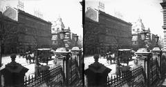 Trefort-kert, kilátás a Budapesti Tudományegyetem Fizikai Intézetének épületéből (később az ELTE / Eötvös Loránd Tudományegyetem Bölcsészettudományi Kar D épülete) a Múzeum körút felé. Jobbra a Pannónia szálló hátsó homlokzata (majd az egyetemi épülete), távolabb a Nemzeti Színház tornyos épülete. A felvétel 1900 előtt készült.