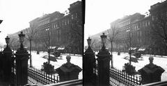 Trefort-kert, a felvétel a Puskin (Eszterházy) utca közelében készült. szemben a Budapesti Tudományegyetem (később az ELTE / Eötvös Loránd Tudományegyetem Bölcsészettudományi Kar) a C épülete felett az A épület kéménye látható, jobbra a D épület. A felvétel 1900 előtt készült.