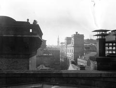 Trefort-kert, kilátás a Budapesti Tudományegyetem Fizikai Intézetének épületéből (később az ELTE / Eötvös Loránd Tudományegyetem Bölcsészettudományi Kar D épülete) a Múzeum körút felé, távolabb a Belvárosi Ferences templom tornya. Jobbra a Nemzeti Színház tornyos épülete. A felvétel 1900 előtt készült.