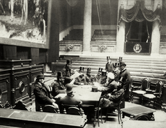 a Magyar Nemzeti Múzeum díszterme, ekkor főrendiházi ülésterem. Munkácsy Mihály Honfoglalás című festményének átvétele, az Országház építkezése Végrehajtó Bizottságának ülésén. Az előadó Neÿ Béla (állva olvas), tőle balra gróf Szapáry István, jobb oldalán Szmrecsányi Miklós. Velük szemben kalap nélkül Munkácsy Mihály, az ő háta mögött Steindl Imre áll, mellette Telepy Károly, a művész bal oldalán báró Harkányi Frigyes. A felvétel 1894 telén készült.