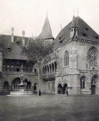 Millenniumi kiállítás: Vajdahunyad vára, a történelmi főcsoport gótikus épületeggyütese. Balra az Apostolok tornya és a Hunyadi-loggia, előtérben a Pozsonyi kút. A felvétel 1896-ban készült. A kép forrását kérjük így adja meg: Fortepan / Budapest Főváros Levéltára. Levéltári jelzet: HU.BFL.XV.19.d.1.01.009
