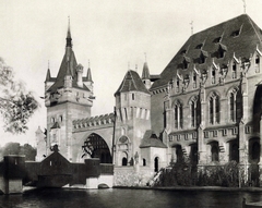 Városligeti-tó és a millenniumi kiállításra épített Vajdahunyad vára a hozzávezető fahíddal. Balra a Kaputorony, jobbra pedig a segesvári palotahomlokzat látható a bástyatoronnyal. A felvétel 1896-ban készült. A kép forrását kérjük így adja meg: Fortepan / Budapest Főváros Levéltára. Levéltári jelzet: HU.BFL.XV.19.d.1.01.011