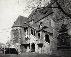 Millenniumi kiállítás: Vajdahunyad vára, a történelmi főcsoport gótikus épületegyüttese, a Csütörtökhelyi kápolna és a keresdi fedett lépcső. Jobbra a Mátyás király-dombormű a bautzeni emlékmű másolata. Balra a háttérben a Budapesti korcsolyázó-egylet palotája. A felvétel 1896-ban készült. A kép forrását kérjük így adja meg: Fortepan / Budapest Főváros Levéltára. Levéltári jelzet: HU.BFL.XV.19.d.1.01.014