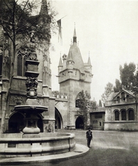 Millenniumi kiállítás: Vajdahunyad vára, a történelmi főcsoport gótikus épületegyüttese a Pozsonyi kúttal. A felvétel 1896-ban készült. A kép forrását kérjük így adja meg: Fortepan / Budapest Főváros Levéltára. Levéltári jelzet: HU.BFL.XV.19.d.1.01.007