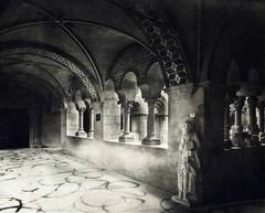 a millenniumi kiállításra épített történelmi főcsoport román kori épületegyüttese. Kerengő, Árpád-kori pillérek, gyámkövek és oszlopfők másolataival. A felvétel 1896-ban készült. A kép forrását kérjük így adja meg: Fortepan / Budapest Főváros Levéltára. Levéltári jelzet: HU.BFL.XV.19.d.1.01.029