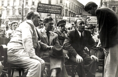 Baross tér, háttérben a Bethlen Gábor utca torkolata. Vas Zoltán a tervhivatal vezetője, Marosán György könnyűipari miniszter és Kádár János belügyminiszter a Keleti pályaudvarra érkezett londoni olimpikonok ünnepélyes fogadtatásán.