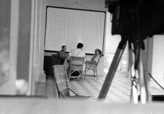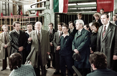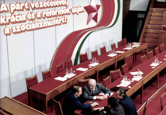 Városligeti (Gorkij) fasor, Építők Rózsa Ferenc Művelődési Háza, nagyterem. Kádár János a Magyar Szocialista Munkáspárt vezetője (balról a második), Lukács János az MSZMP KB titkára (balra, háttal), Gyenes András az MSZMP KB elnöke (jobbra, háttal) és Grósz Károly az MSZMP PB tagja, a kormány elnöke. A felvétel az MSZMP országos értekezletén készült, az 1988. május 21-i ülés szünetében.