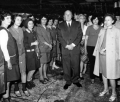 Kádár Jánosról a Magyar Szocialista Munkáspárt vezetője a gyárudvaron, hölgyek gyűrűjében.