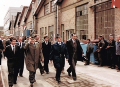 Meder utca 9., Magyar Hajó- és Darugyár, Daru- és Kazángyáregység. Kádár János a Magyar Szocialista Munkáspárt vezetőjének látogatása, tőle balra dr. Steiner Arnold a gyár párttitkára, mögötte jobbra Fabriczki András a Budapesti Pártbizottság titkára és Deák Gábor a XIII. kerületi pártbizottság első titkára, előrébb Szép János a gyár vezérigazgatója és Maróthy László a budapesti pártbizottság első titkára. A felvétel 1982. április 30-án készült.