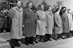 Hősök tere, Kádár János a Magyar Szocialista Munkáspárt vezetője, Münnich Ferenc, Marosán György a Budapesti Pártbizottság titkára, Apró Antal Magyarország állandó képviselője a KGST tanácsában, Kállai Gyula a Hazafias Népfront Országos Tanácsának elnöke, Somogyi Miklós a SZOT elnöke, K. T. Mazurov, háttérben a Szépművészeti Múzeum