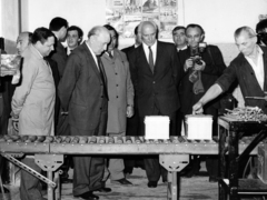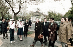 Váci út 135-139., Akkumulátor- és Szárazelemgyár. Kádár János a Magyar Szocialista Munkáspárt vezetője, középen Herczeg Ferenc igazgató, háttal Maróthy László a Budapesti Pártbizottság első titkára Fabriczki Andrásal,a Budapesti PB titkárával beszélget. A felvétel 1984. április 26-án készült.