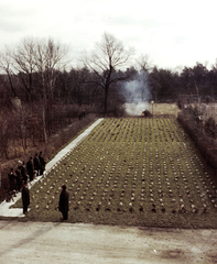 előtérben Kádár János a Magyar Szocialista Munkáspárt vezetője, vadászat után megtekinti a terítéket.