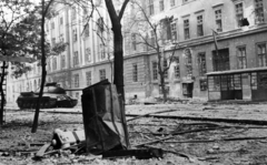 kilőtt szovjet harckocsi maradványa az Üllői út és a Nagykörút kereszteződésénél, balra a Kilián laktanya, háttérben a Ferenc körút 46. számú romos épület.