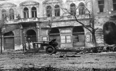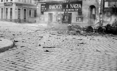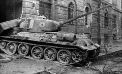 József körút, kiégett szovjet T-34/85 harckocsi Corvin (Kisfaludy) köz előtt.