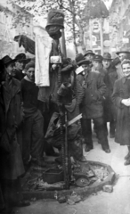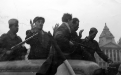 II. János Pál pápa (Köztársaság) tér, a pártház ostromakor meglincselt védő holtteste, háttérben az Erkel Színház.