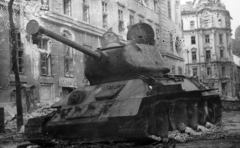 kilőtt szovjet T-34/85 harckocsi az Üllői úton, háttérben a Kilián laktanya és jobbra a Ferenc körút 46. számú romos épület.