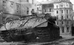 kilőtt szovjet ISZ-3 nehézharckocsi a Kilián laktanya előtt.