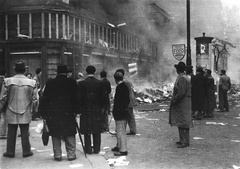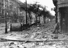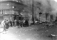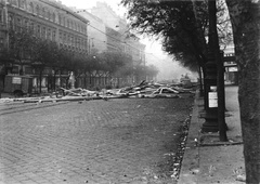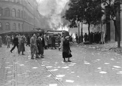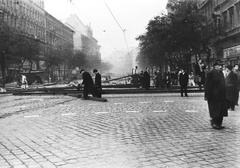 Blaha Lujza tér, felborított és lángoló villamosok a József körútnál. Háttérben a Népszínház utca torkolatánál álló épületek láthatók.