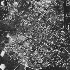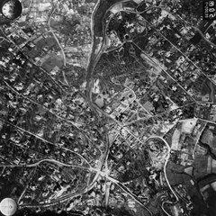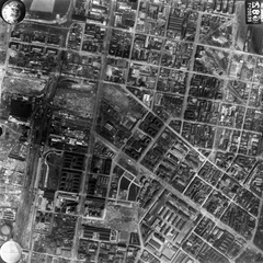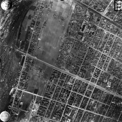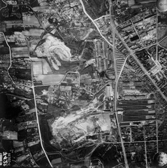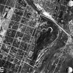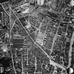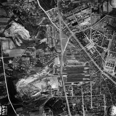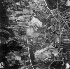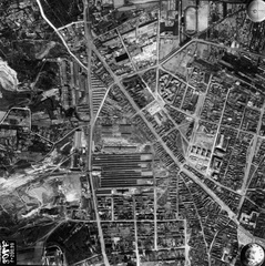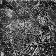 légifotó, Óbuda. Bal oldalt a Bécsi út mellett a Bohn téglagyár, lejjebb az Újlaki téglagyár. Jobbra lenn a Flórián tér, ide torkollik a Vörösvári út és a Szentendrei út. Fenn a Hévízi úti sporttelep látszik. A felvétel 1944. április 14-én készült.