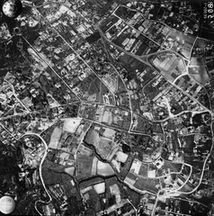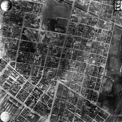 légifotó, Kelenföld. A kép középvonalától jobbra a Fehérvári út. A félkör alakú teresedésnél a Hengermalom út torkolata, attól balra fenn a Gamma pálya. Alul a Fehérvári úton az Alberfalvai (villamos / HÉV) kitérő a Kondorosi út előtt. A felvétel 1944. április 14-én készült.