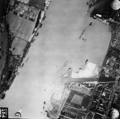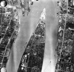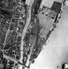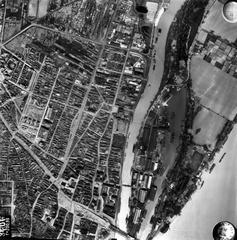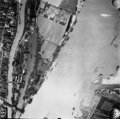 légifotó, Óbudai-sziget. Balra az Óbudai rakpart, lenn a Hajógyári-öbölnél az épülő Árpád híd első, szerkezetkész szakasza. Lenn az áradó Duna közepén a Margit-sziget csúcsa, jobbra a Vizafogónál a Rákos-patak torkolata látszik. A felvétel 1944. április 14-én készült.
