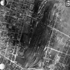légifotó, Rákosrendező pályaudvar. Alul a Szegedi út és a Teleki Blanka út találkozása. A felvétel 1944. április 14-én készült.