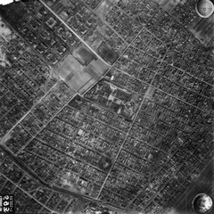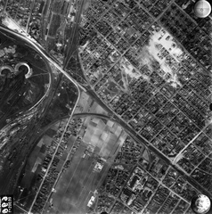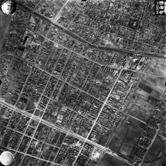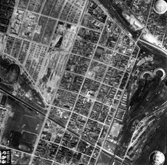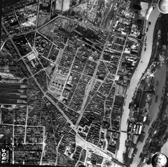 légifotó, Angyalföld. A kép középvonalától balra a Béke utca, ezt keresztezi lenn a Rákos-patak a Tahi utcánál. Lejjebb balra a Fáy utcánál a mai Vasas sporttelep, míg a kép jobb oldalán feljebb az Északi Fűtőház, a mai Vasúttörténeti Park látszik. A felvétel 1944. április 14-én készült.