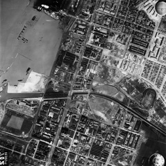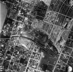 légifotó. Balra fenn a Hajógyári-öbölnél az épülő Árpád híd első, szerkezetkész szakasza. A Margitszigeten lenn a Palatinus Strandfürdő. Jobbra Vizafogó, a Latorca utcai Elektromos sportteleppel és a Szentistvánvárosi (korábban Lipótvárosi) teherpályaudvarral. A felvétel 1944. április 14-én készült.