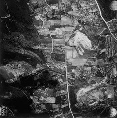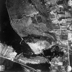 légifotó, bal oldalon a Remetehegyi út és a Máramarosi út - Perényi út találkozása. Középen a Bécsi út mellett a Bohn téglagyár, lejjebb az Újlaki téglagyár. Fenn a Vörösvári út becsatlakozása. A felvétel 1944. április 14-én készült.