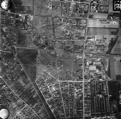 légifotó, Angyalföld. Bal oldalon az elöntött Duna-part a Vizafogónál és a Váci út. Keresztben az enyhén kanyarodó Rákos-patak és a Tahi utca látszik. A felvétel 1944. április 14-én készült.